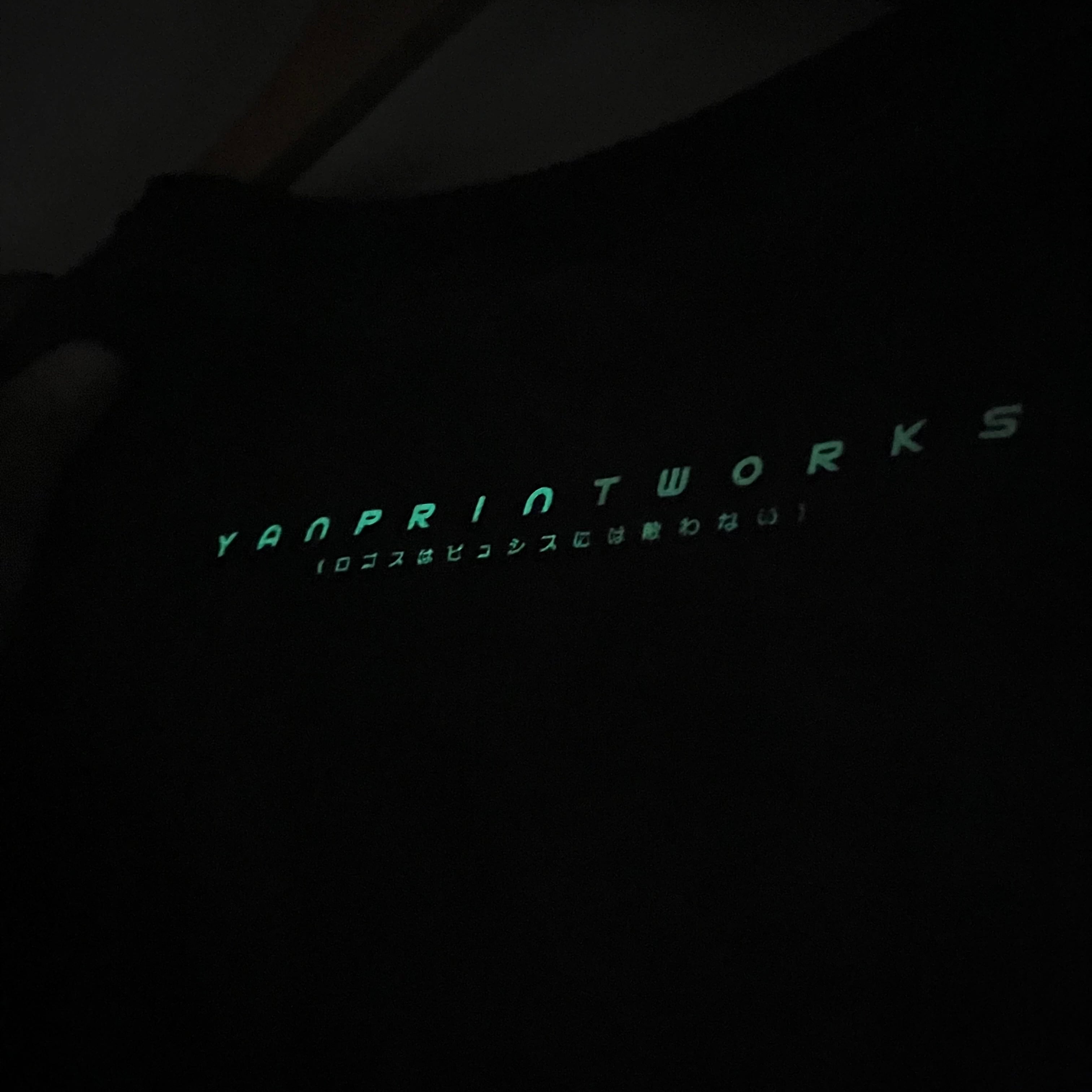 バックのプリントはホワイトインクの上に蓄光(glow in the dark)を乗せ太陽や蛍光灯の紫外線を吸収し暗闇で緑色に光る仕様